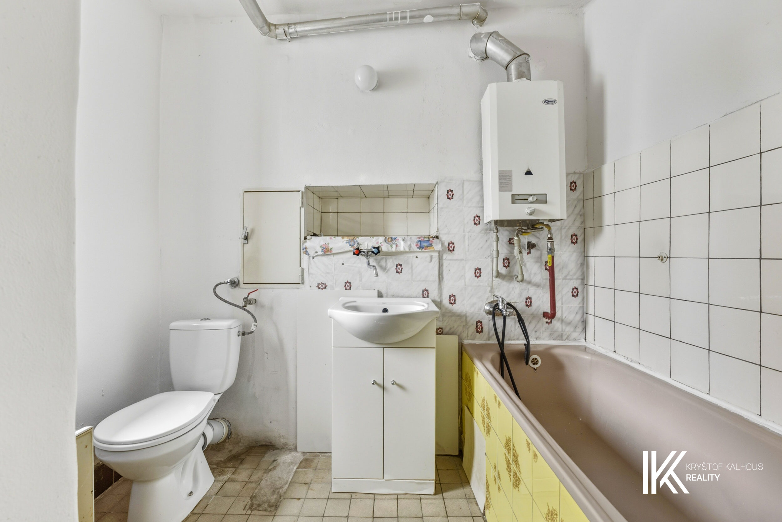 Koupelna je společná s toaletou a čeká na kompletní proměnu. Může se z ní stát moderní koupelna se sprchovým koutem, velkým zrcadlem a elegantními obklady, nebo klidně stylový retro prostor s barevnými dlaždicemi.