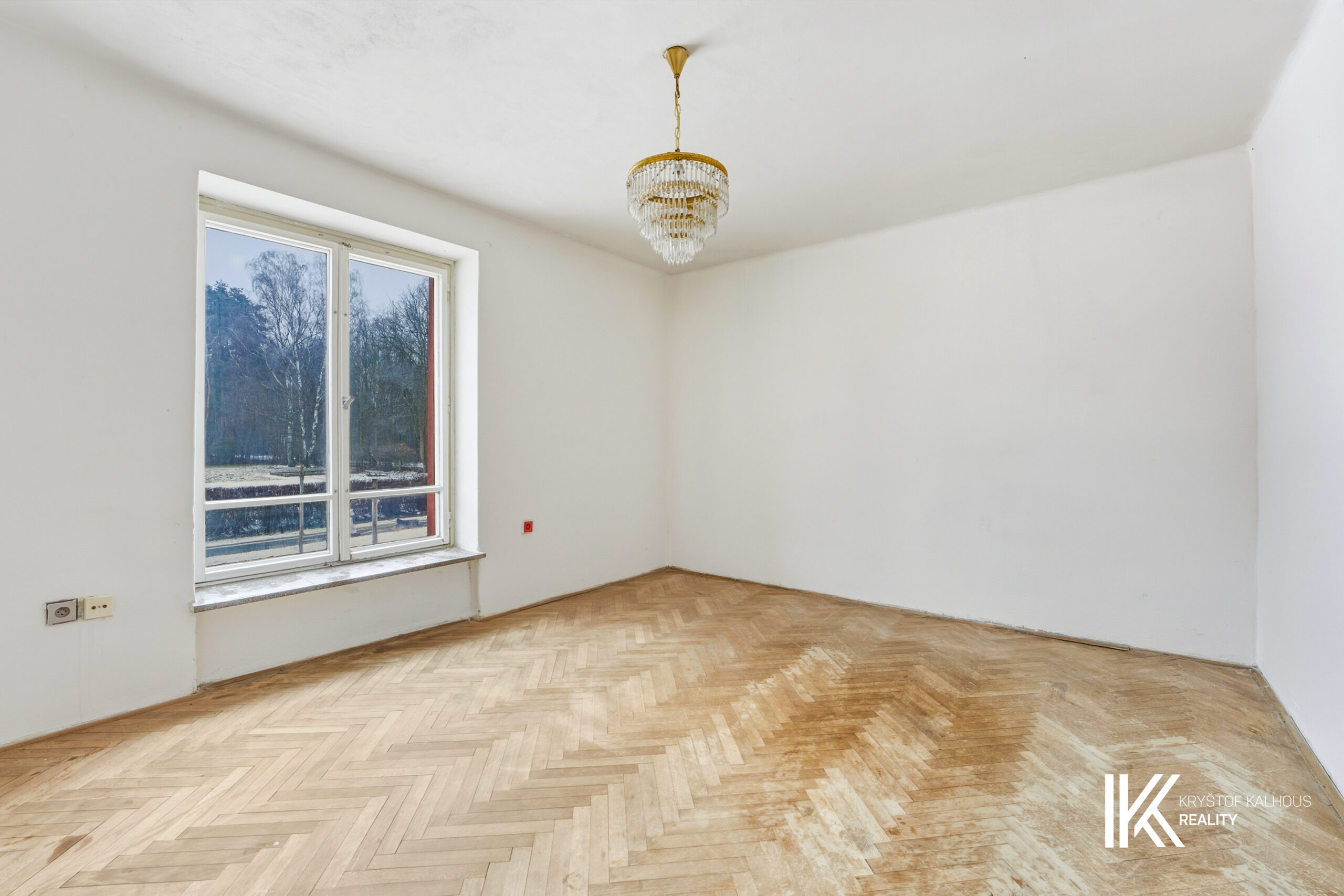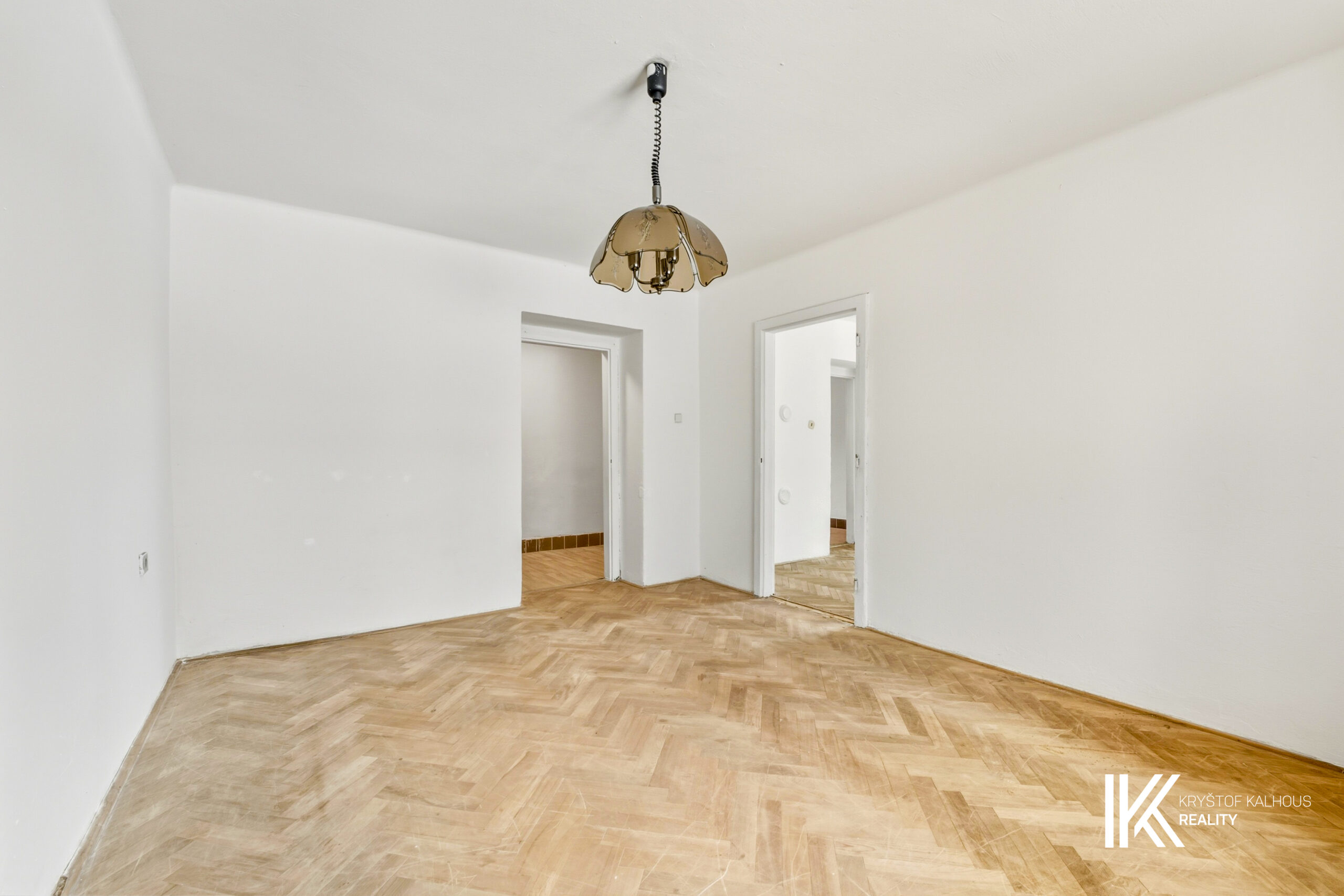 Duši bytu tvoří dva pokoje, které jsou samostatné, ale zároveň vzájemně průchozí, což ponechává budoucímu řešení příjemnou variabilitu. První pokoj je orientovaný na východ a přímo navazuje na kuchyň. Je tak ideálním místem pro obývací prostor – místo, kde se potká denní světlo, rodina i návštěvy. Dokážete si tu snadno představit pohodlný gauč, knihovnu nebo pracovní kout, přičemž dřevěné parkety pod nohama dodávají místnosti hřejivý, přirozený charakter a připomínají poctivou kvalitu starších bytů.
