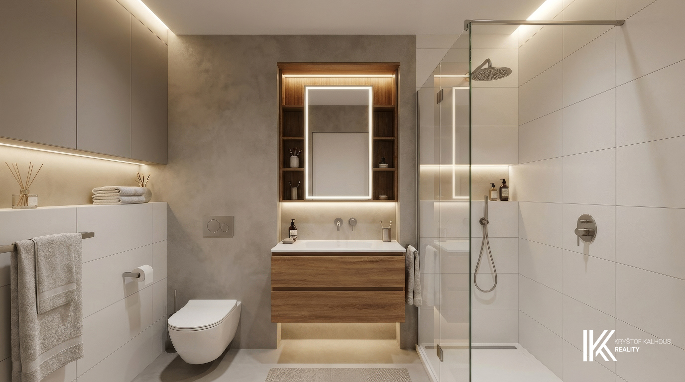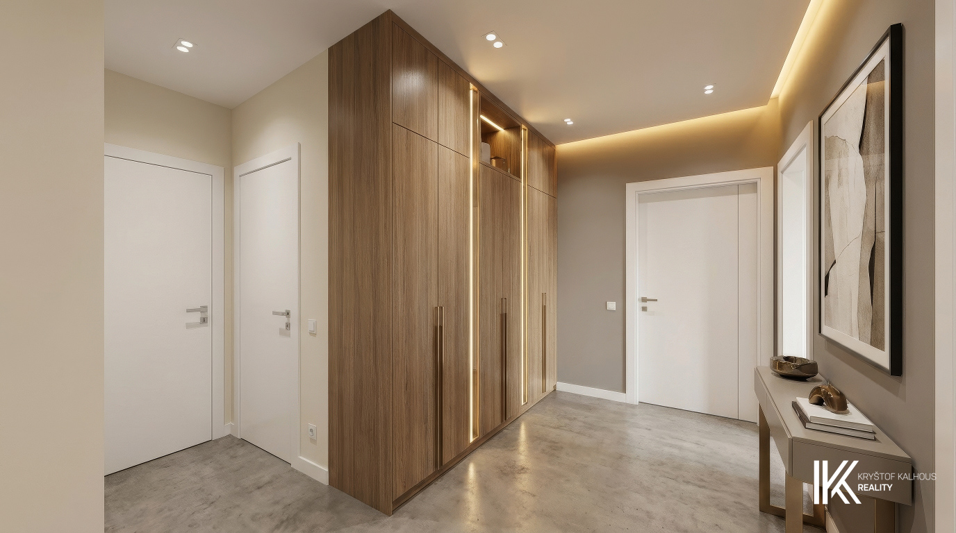 Vše propojuje vstupní prostorná předsíň. Díky své velikosti to není jenom průchozí prostor, ale místo, kde si můžete vytvořit praktické úložné zázemí – velkou šatní skříň s botníkem, věšáky apod. Tento prostor dává bytu příjemný pocit vzdušnosti již od prvního kroku dovnitř.