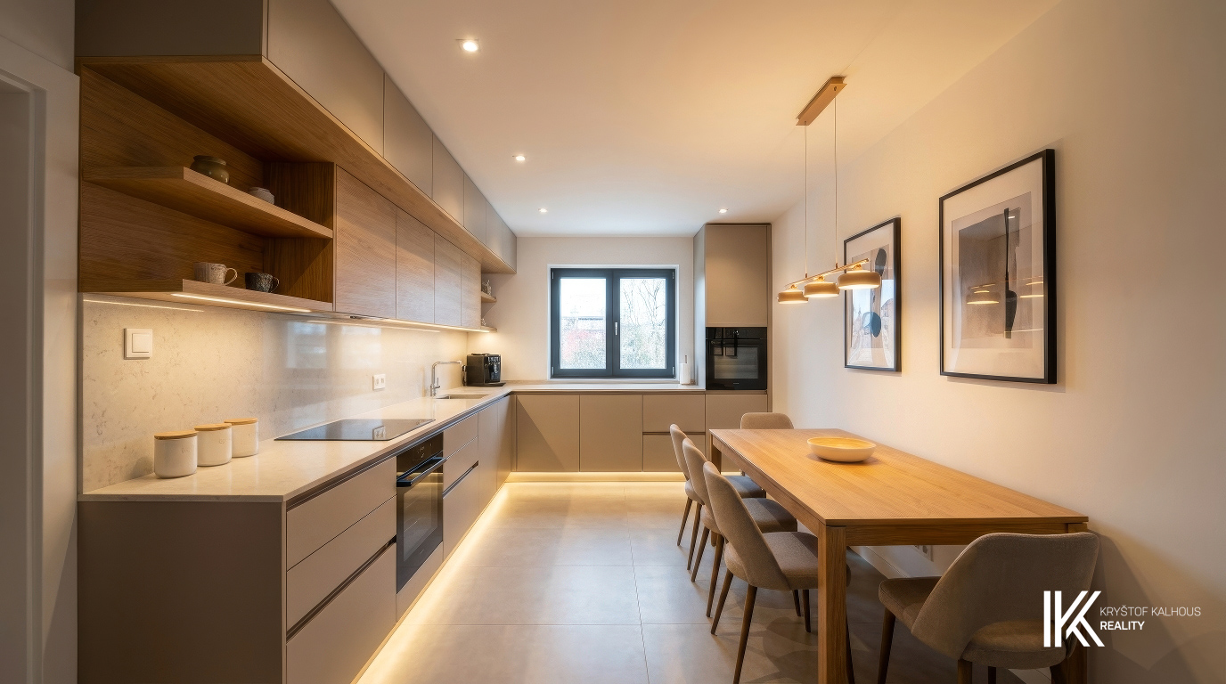 Kuchyně je samostatná a orientovaná na sever. Je bez kuchyňské linky, což znamená čistý list papíru – můžete si ji navrhnout přesně podle svého vkusu. Může zde vzniknout moderní kuchyň s ostrůvkem, venkovsky laděný prostor s dřevěnými prvky nebo minimalistická světlá kuchyň plná světla. Severní orientace je navíc praktická – v létě se zde nepřehřívá a vaření je tak příjemnější.