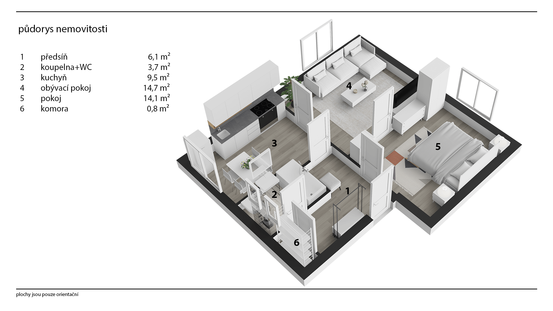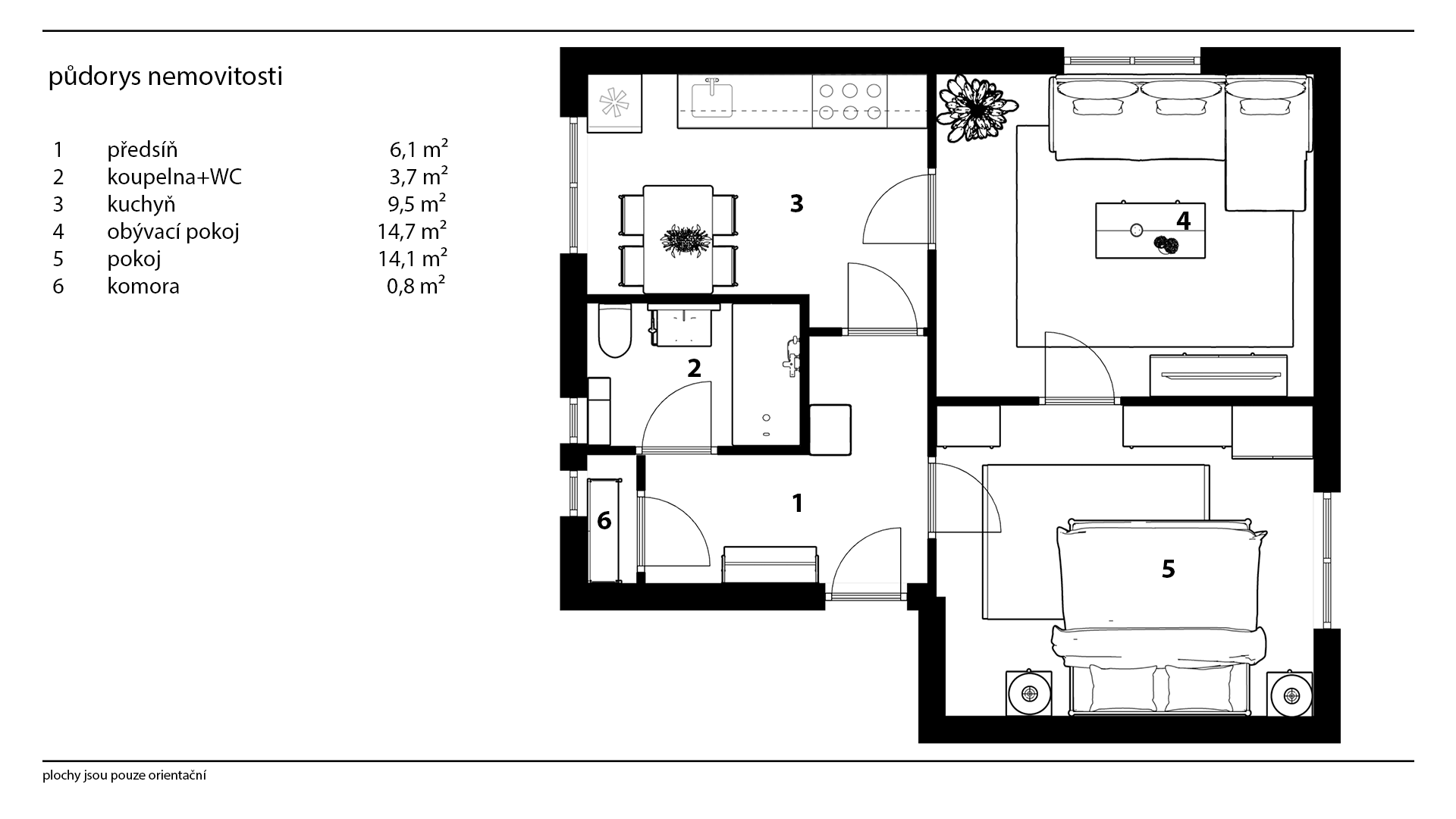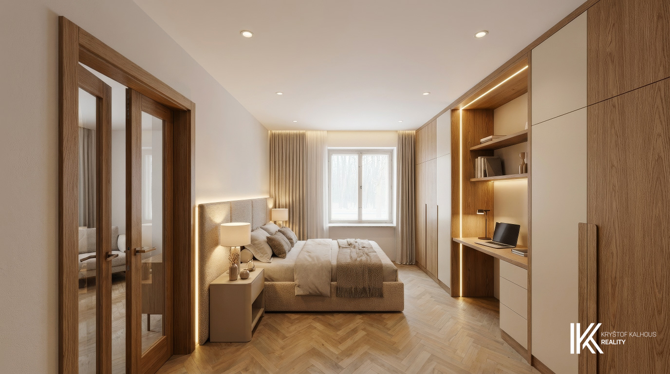 Druhý pokoj směřuje na jih, je zalitý světlem a teplem po většinu dne. Je menší a situovaný dále od kuchyně, vybízí tak k vytvoření tichého útočiště – ložnice s postelí u okna, šatní skříní a čtecím koutkem. Díky průchodnosti mezi pokoji lze byt ponechat otevřený a vzdušný, nebo ho při rekonstrukci více oddělit podle vašich potřeb.