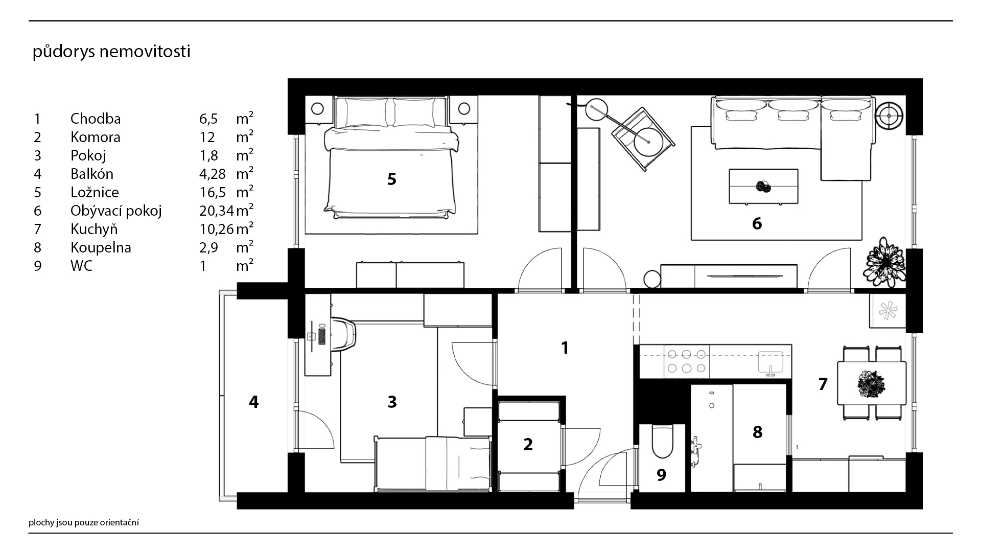 | Náklady na bydlení | předpis plateb pro SVJ 8 868 Kč (z toho fond oprav 2 591 Kč) + elektřina dle spotřeby |