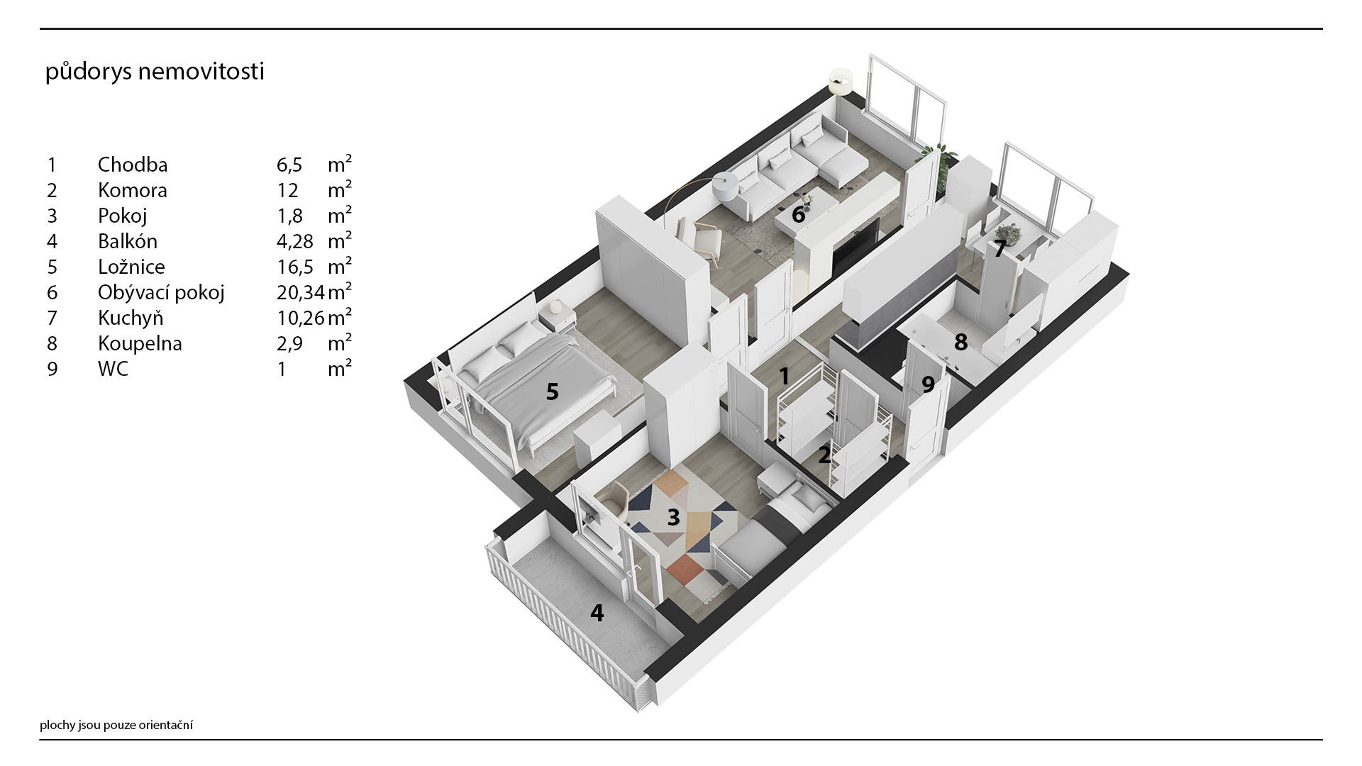 Další dva pokoje jsou samostatné a neprůchozí. Jeden z nich má navíc vlastní balkon – místo, kde si ráno vychutnáte kávu, večer sklenku vína nebo kde můžete pěstovat bylinky a květiny. Tento pokoj může sloužit jako ložnice s příjemným napojením na venkovní prostor, nebo jako dětský pokoj. Další pokoj se pak může stát druhým dětským pokojem, pracovnou nebo třeba pokojem pro hosty – podle aktuálních potřeb rodiny.