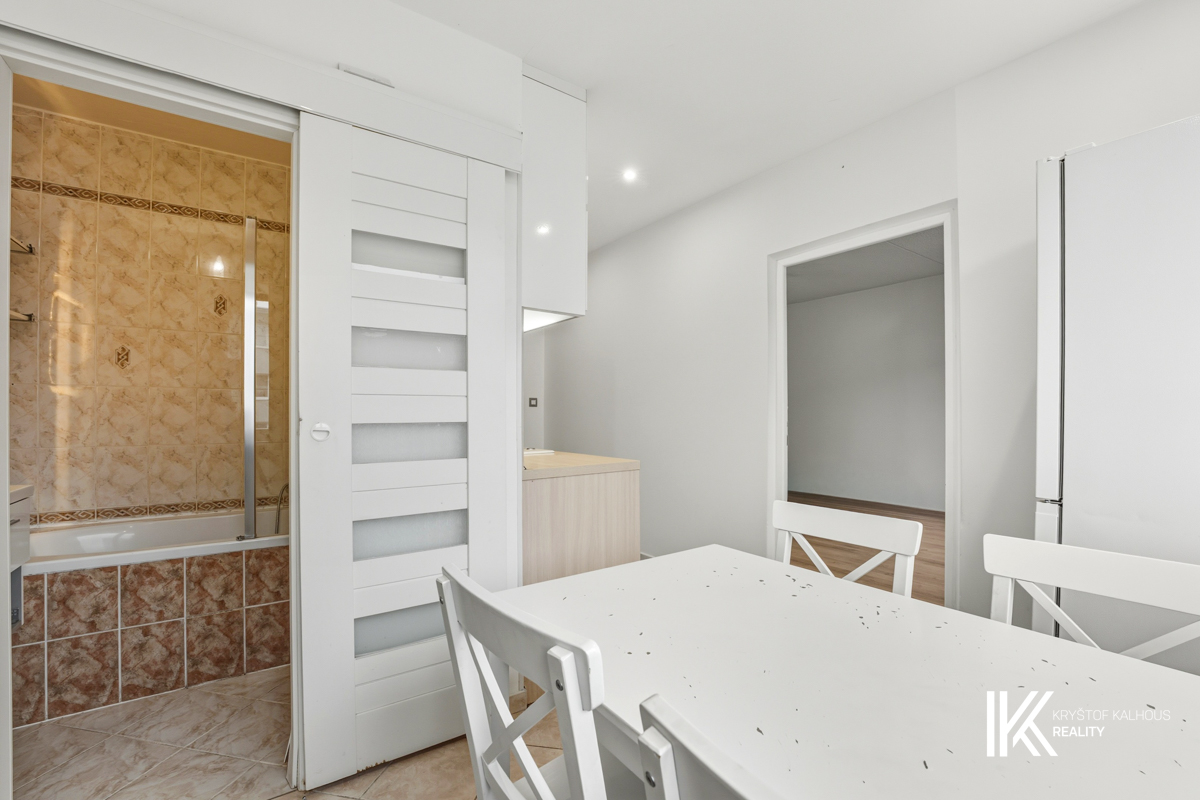 Kuchyně je samostatná, řešená do tvaru L, s vlastní jídelní částí. Je to prostor, kde má všechno své místo – pracovní plocha, úložné skříňky i stůl, u kterého můžete začínat den společnou snídaní. Díky oddělení od obývací části zůstává vaření přirozeně oddělené, ale zároveň jste stále v kontaktu s děním v bytě.