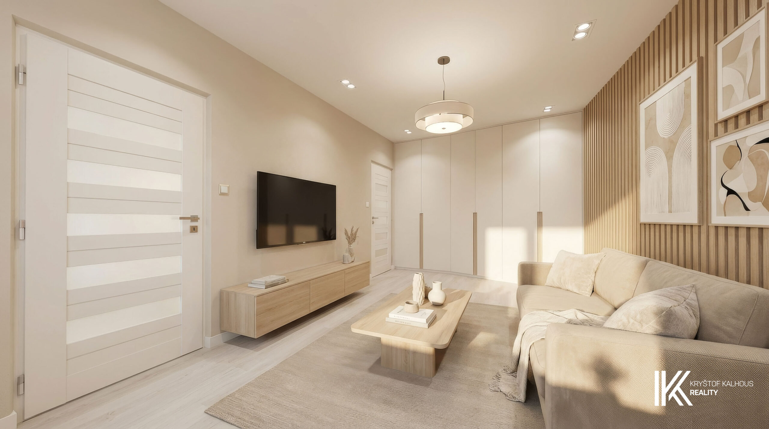 Obývací pokoj je přístupný jak z chodby, tak z kuchyně, což mu dodává příjemnou otevřenost a variabilitu. Může fungovat jako přirozené centrum bytu – místo, kde se potkává rodina. Díky propojení s kuchyní působí vzdušně a světle, a přitom si zachovává dostatek soukromí.