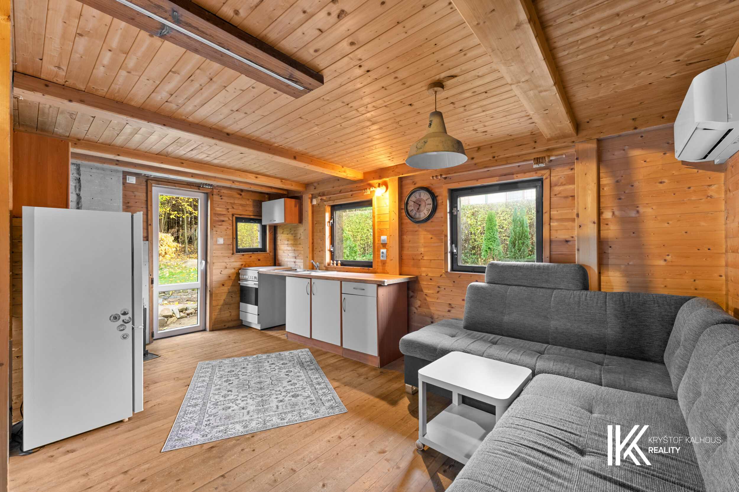Tato kouzelná dvoupodlažní chata stojí na vlastním pozemku, což v této oblasti nebývá zvykem. Jedná se o dřevostavbu s betonovými základy, která je výjimečná svou dispozicí. Je řešená jako dvě zcela samostatné obytné jednotky s vlastním vstupem a přirozeně odděleným provozem. Pod jednou střechou tak vznikají dvě svébytná místa k odpočinku, která mohou fungovat jak spolu, tak i zcela nezávisle.