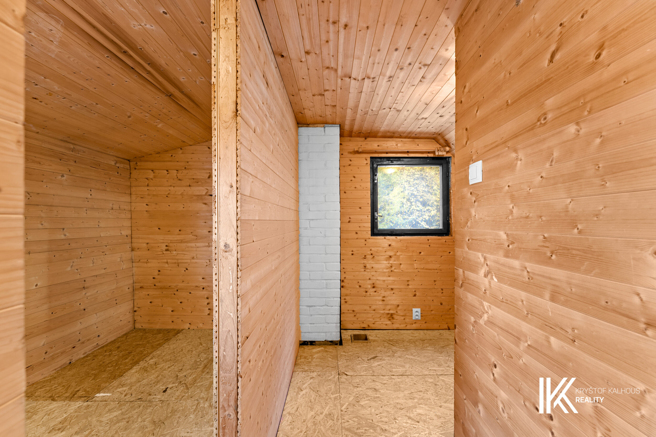 V patře se pak nachází tři malé pokojíky, které doslova dýchají tradicí starých chat. Každý má své kouzlo – menší šikmé stěny i nízká okna s výhledem. Zajišťují spací prostor pro dospělé, děti i hosty, stejně jako místo, kam si zalézt s knihou, když venku prší. Ale popravdě, tady by to chtělo ještě přidat trochu ruku k dílu.
