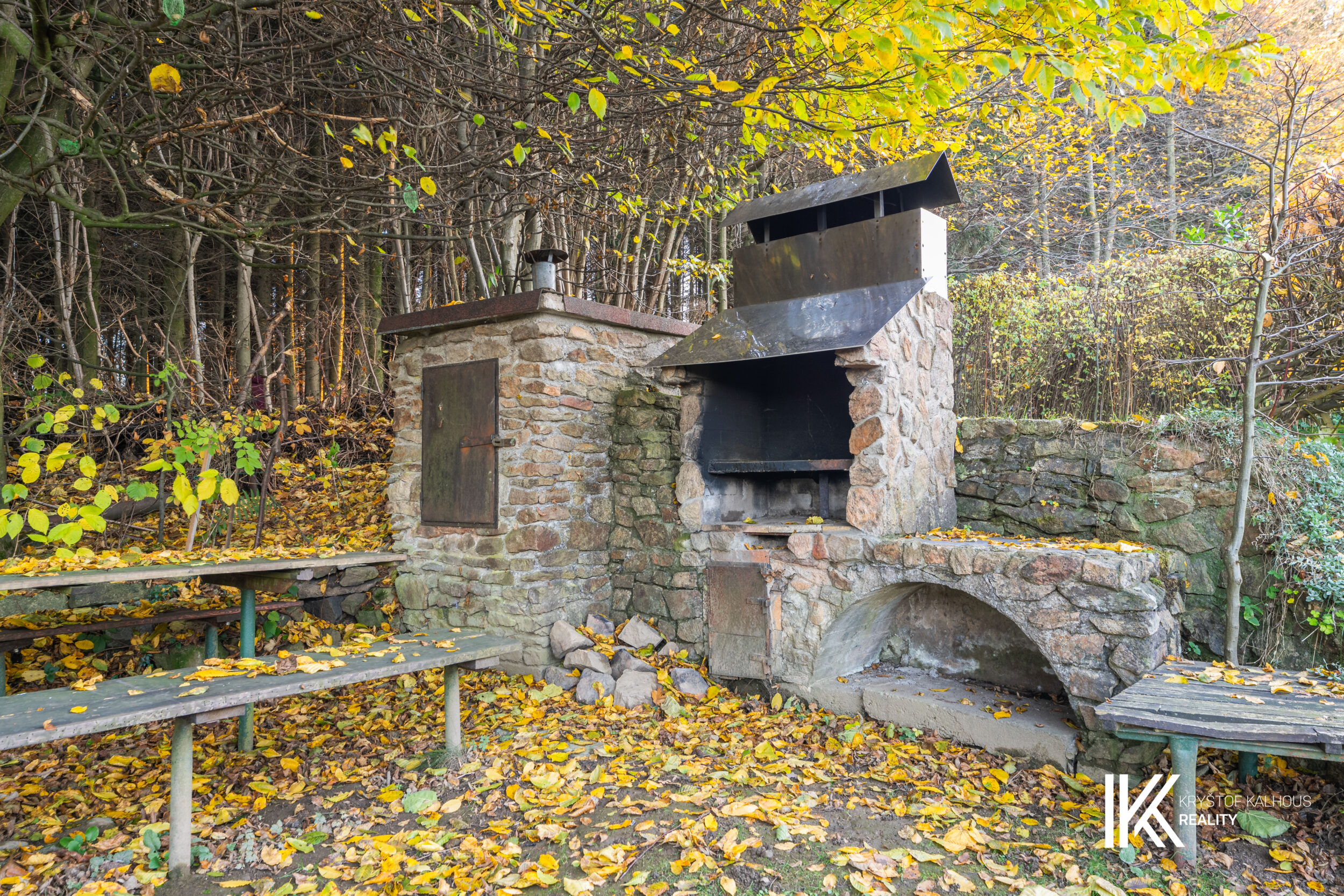 | Příslušenství | přístřešek pro auto, dlážděná terasa, venkovní ohniště, zděný gril, udírna, dřevníky |