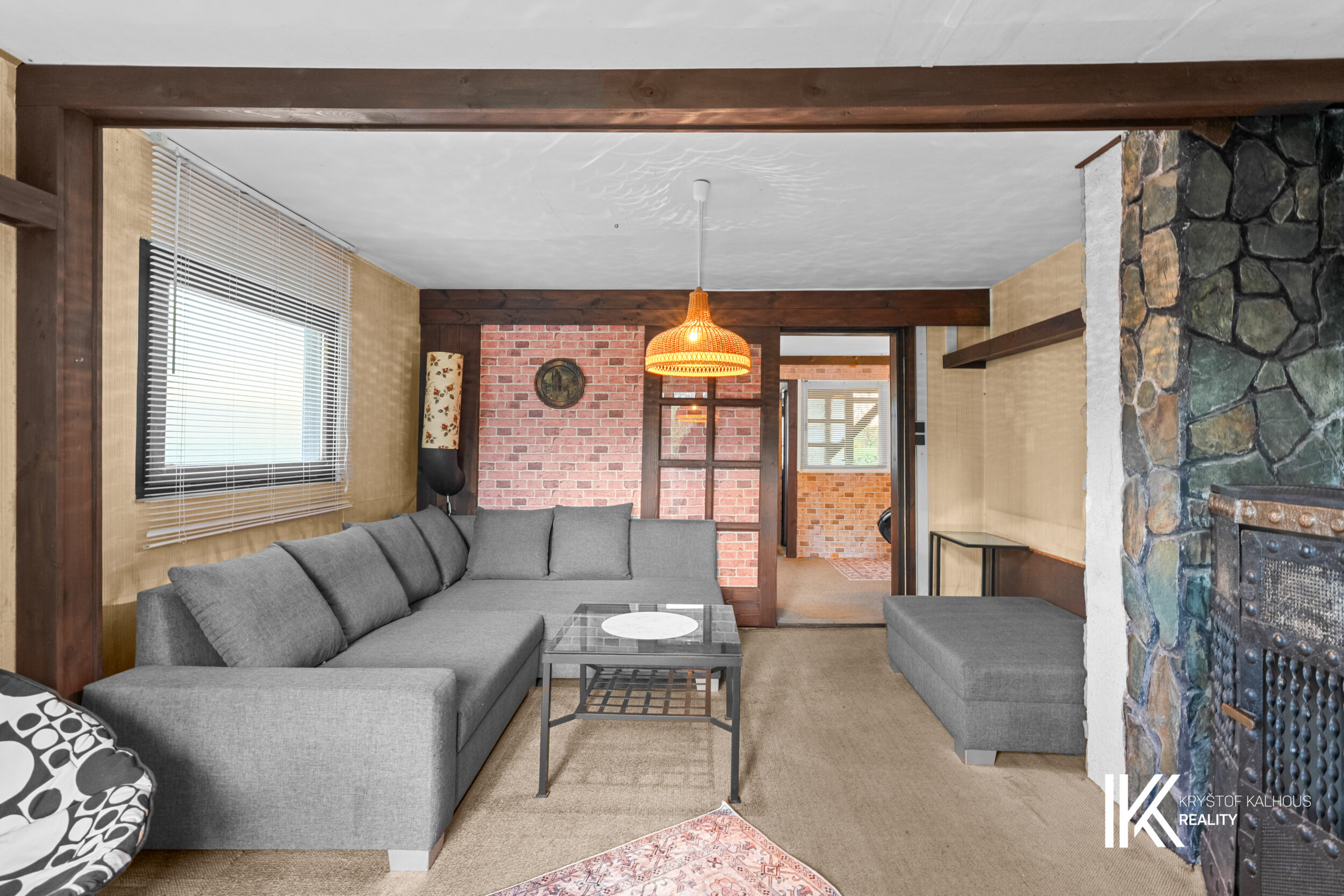 Hlavní obytný prostor působí přirozeně útulně. Kombinuje v sobě starší vybavení a světlo, které sem proudí velkým oknem. Právě tady dříve praskal oheň v kamnech a po večerech se hrály karty. Momentálně v místnosti stojí pouze původní klec, která dříve kamna chránila. Nový majitel si může doplnit vlastní zařízení dle preferovaného způsobu vytápění. Z obýváku se vstupuje přímo na jihozápadně orientovanou dlážděnou terasu, která se stává prodloužením interiéru. V létě sem můžete přenést celý den – od snídaně až po večerní posezení s vínem pod světlem lampionů.