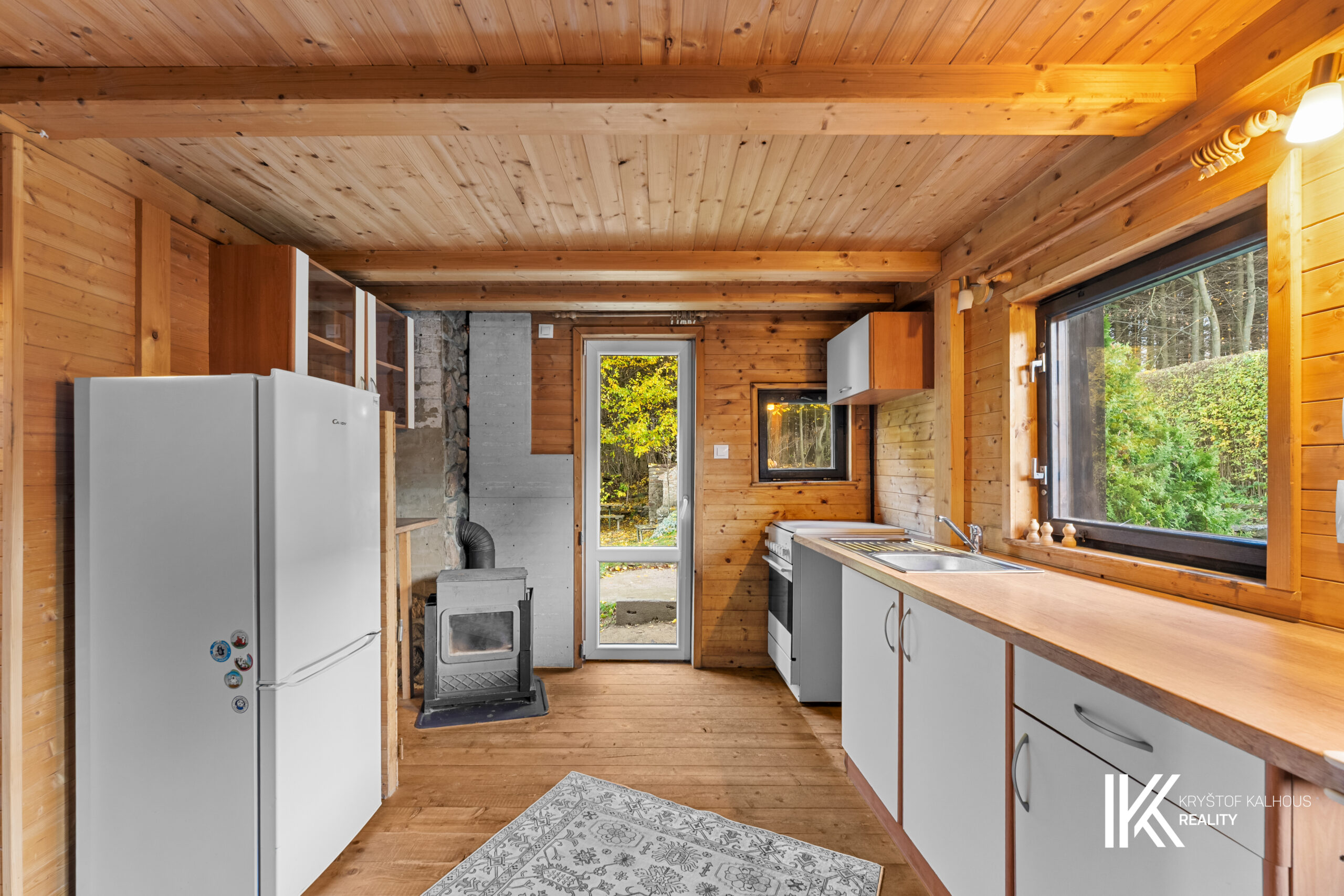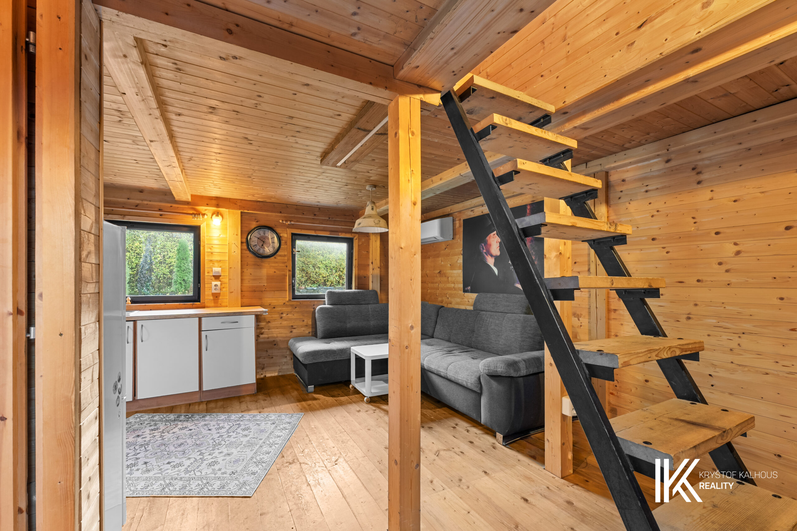 Tato kouzelná dvoupodlažní chata stojí na vlastním pozemku, což v této oblasti nebývá zvykem. Jedná se o dřevostavbu s betonovými základy, která je výjimečná svou dispozicí. Je řešená jako dvě zcela samostatné obytné jednotky s vlastním vstupem a přirozeně odděleným provozem. Pod jednou střechou tak vznikají dvě svébytná místa k odpočinku, která mohou fungovat jak spolu, tak i zcela nezávisle.