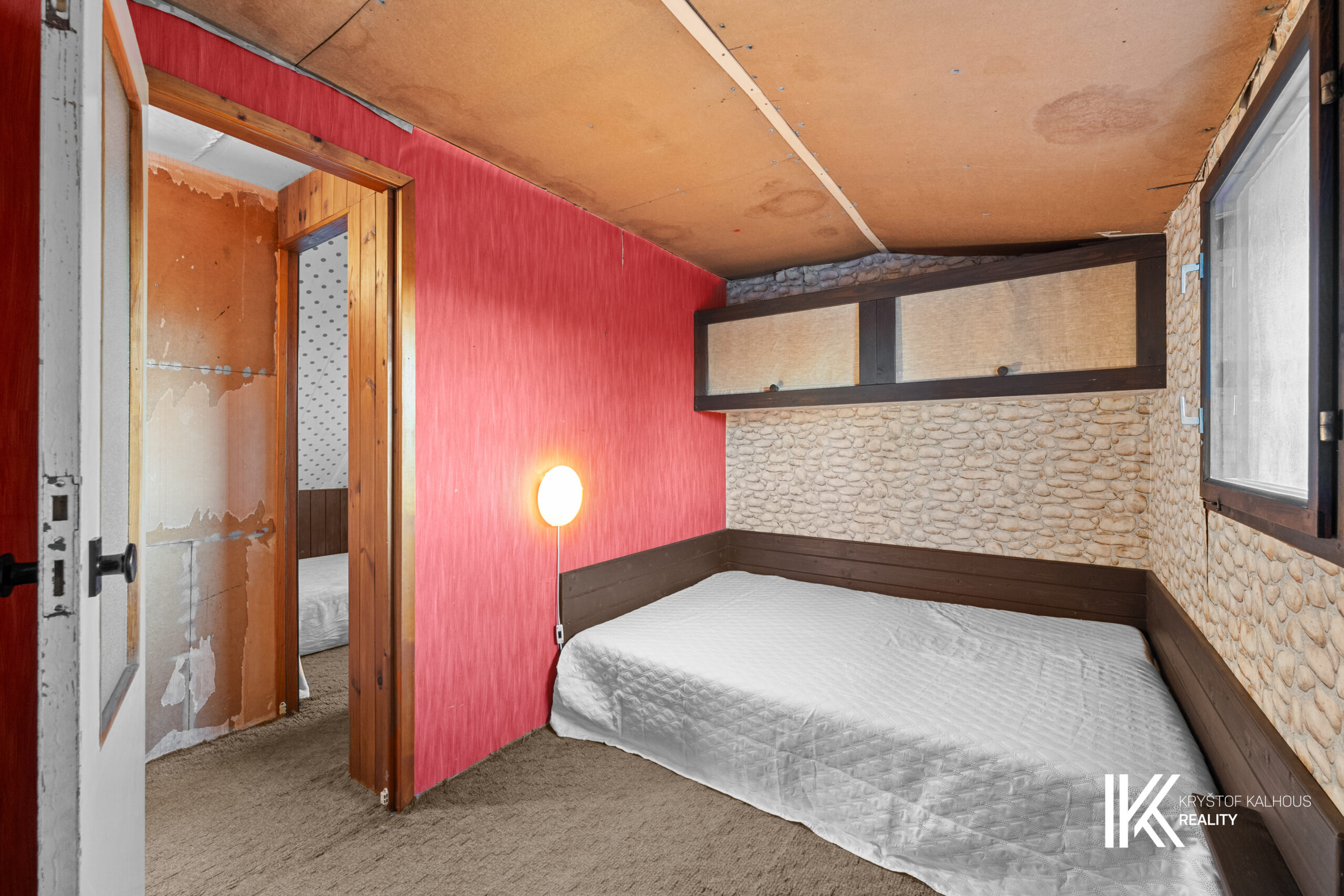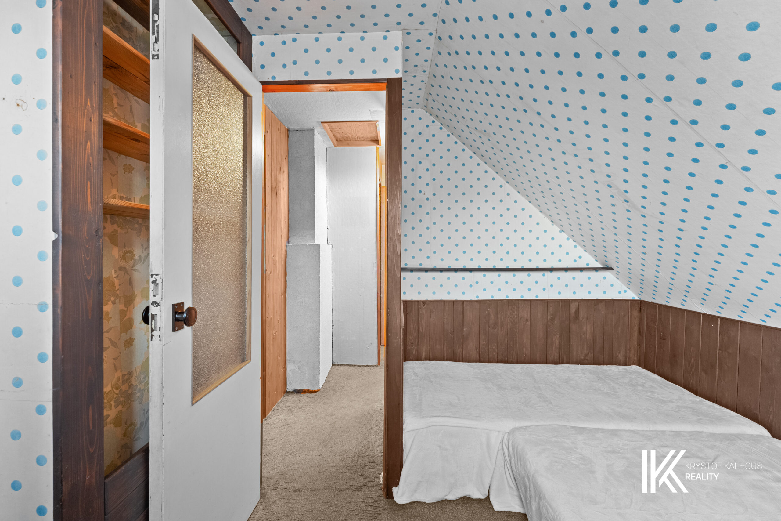 V patře se pak nachází tři malé pokojíky, které doslova dýchají tradicí starých chat. Každý má své kouzlo – menší šikmé stěny i nízká okna s výhledem. Zajišťují spací prostor pro dospělé, děti i hosty, stejně jako místo, kam si zalézt s knihou, když venku prší. Ale popravdě, tady by to chtělo ještě přidat trochu ruku k dílu.