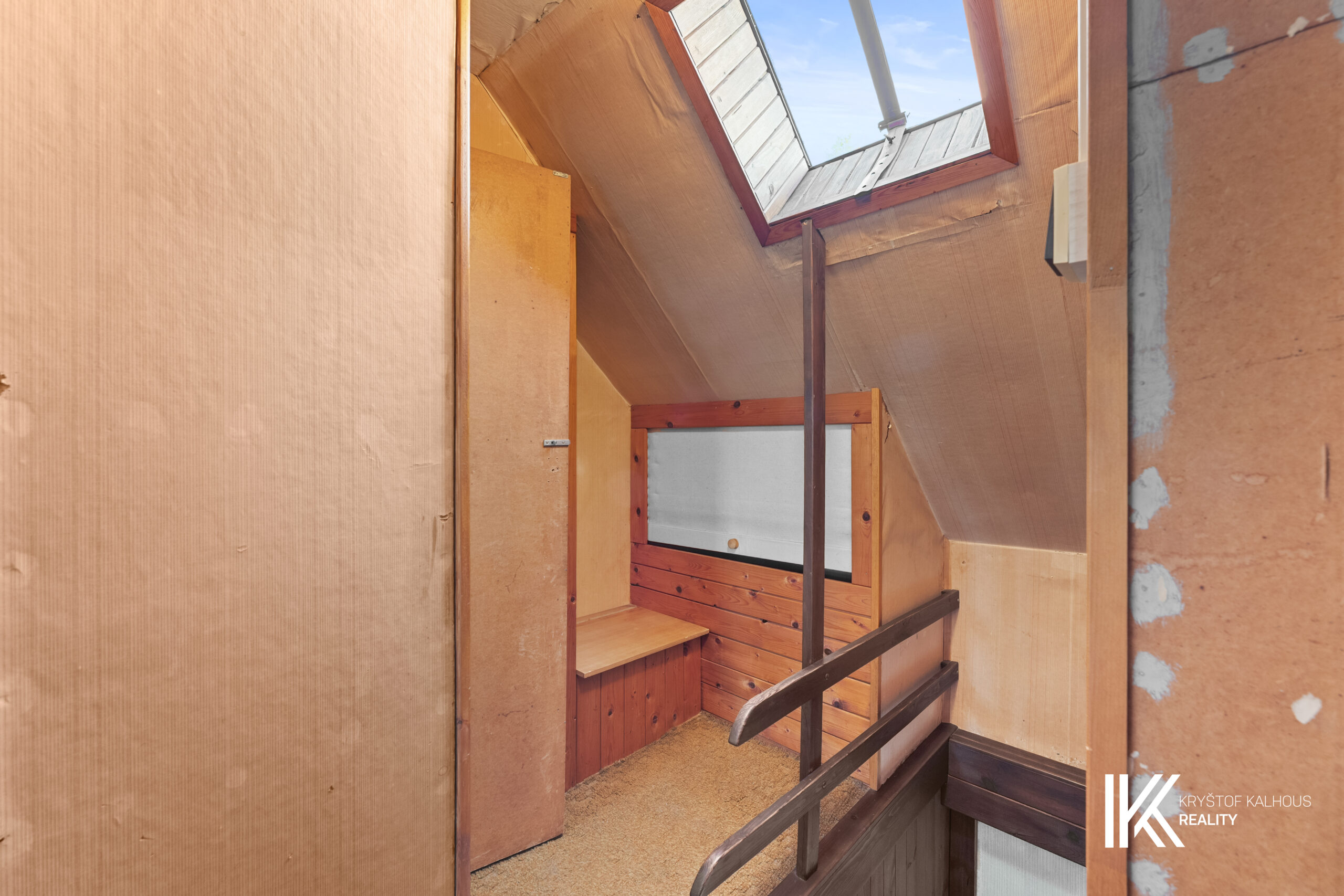 Do patra vede typické chatařské schodiště, úzké a strmější, jaké k těmto stavbám neodmyslitelně patří. Najdete tam dva malé pokojíky, které jsou oddělené pouze dispozičně, nikoliv dveřmi. Ideální místo, kde se spí déle než doma a kde rána začínají klidem.