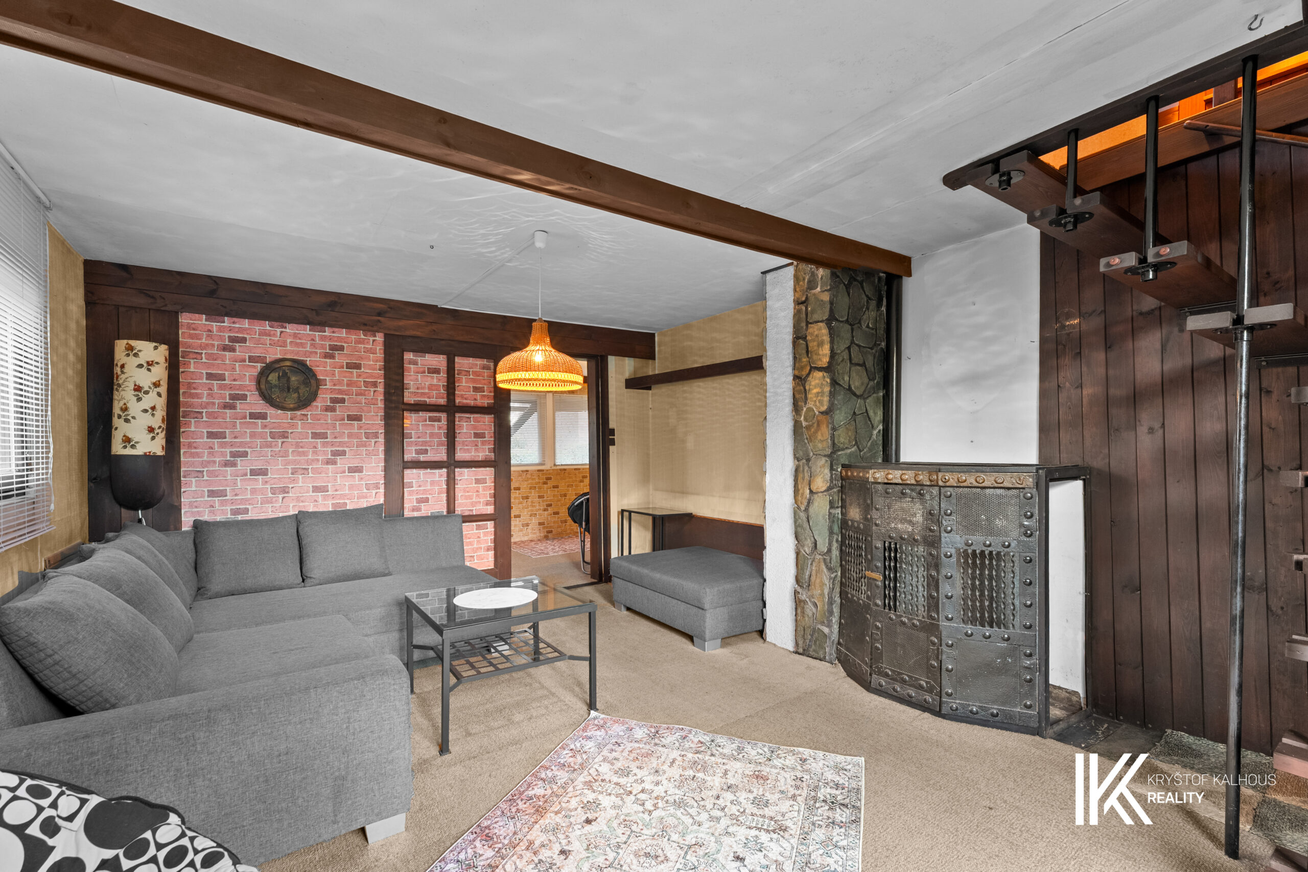 Hlavní obytný prostor působí přirozeně útulně. Kombinuje v sobě starší vybavení a světlo, které sem proudí velkým oknem. Právě tady dříve praskal oheň v kamnech a po večerech se hrály karty. Momentálně v místnosti stojí pouze původní klec, která dříve kamna chránila. Nový majitel si může doplnit vlastní zařízení dle preferovaného způsobu vytápění. Z obýváku se vstupuje přímo na jihozápadně orientovanou dlážděnou terasu, která se stává prodloužením interiéru. V létě sem můžete přenést celý den – od snídaně až po večerní posezení s vínem pod světlem lampionů.
