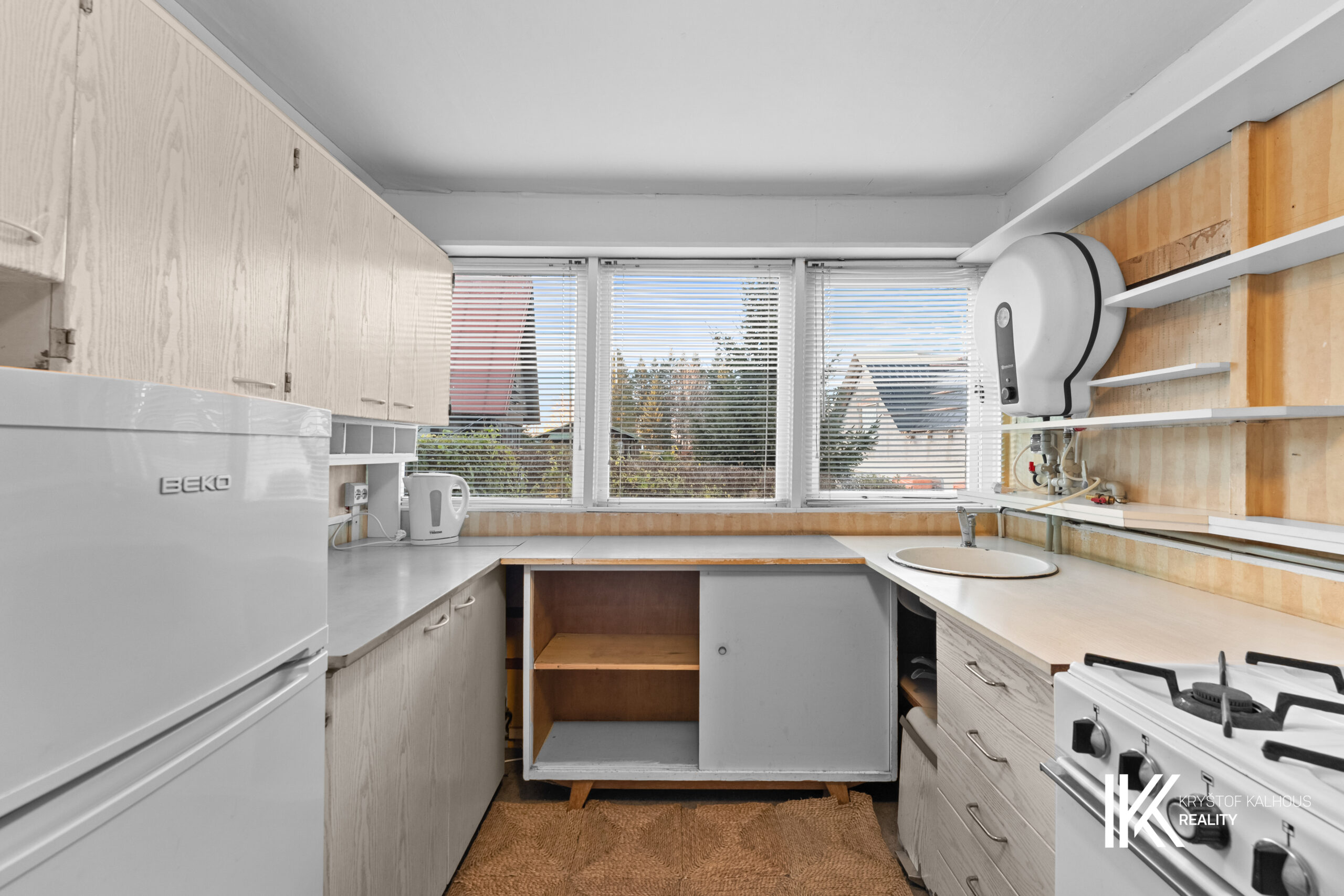 První jednotka o užitné ploše cca 40 m² prošla modernizací a působí svěže a útulně. V přízemí vás přivítá obývací pokoj s kuchyňskou linkou vybavenou dřezem, sporákem na plynovou bombu a lednicí. Prostor, kde si snadno představíte ranní kávu s výhledem do zahrady nebo večerní posezení u kamen, když se venku stmívá. Po boku kuchyňské linky se otevírá výstup ven na zahradu, jihovýchodně směrem k lesu.