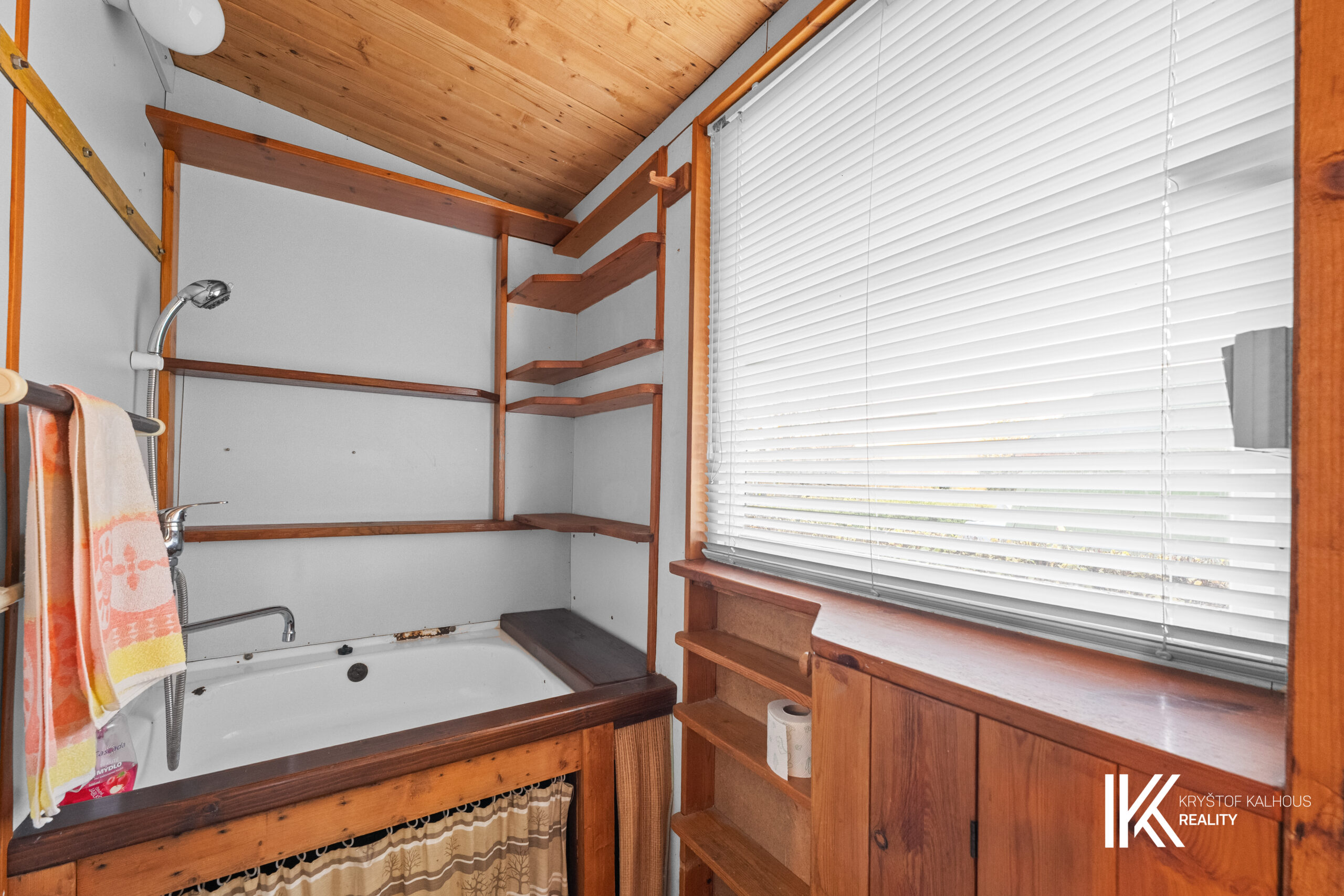 Druhá jednotka, větší a ve svém původním duchu, má užitnou plochu přibližně 53 m² a nese v sobě pravou atmosféru klasické chaty. Za malou předsíní vás přivítá průchozí pokoj. Díky umístění hned vedle kuchyně může skvěle posloužit jako jídelna, anebo pouhé zádveří či prostor pro uložení věcí po dni stráveném venku.
