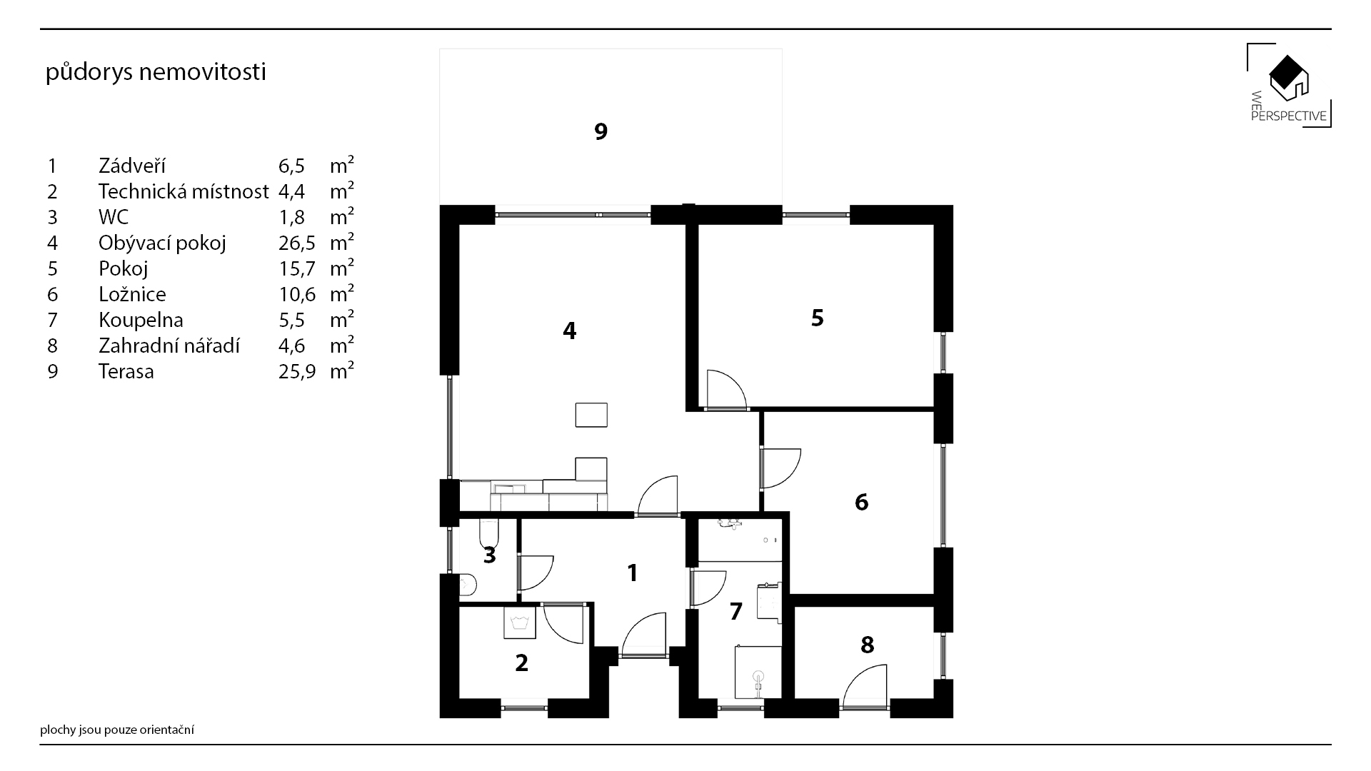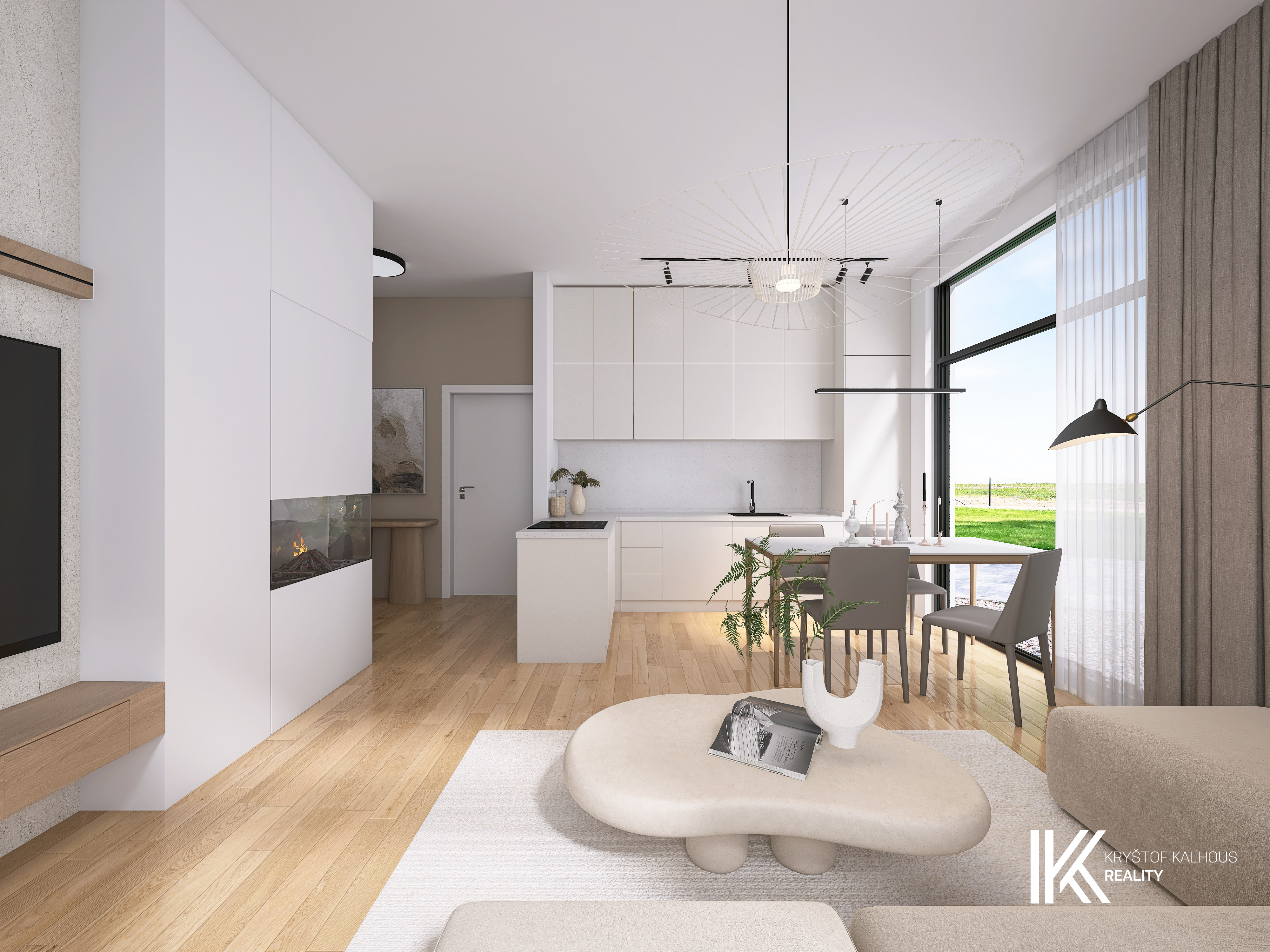 Disponuje prostorným obývacím pokojem, kam můžete umístit krbová kamna a navazuje na část pro kuchyňskou linku. Z obývacího pokoje je přímý vstup na slunnou 25,9 m² terasu, která je ideálním místem pro relax a posezení s rodinou či přáteli. Dále dva samostatné pokoje, kde je prostor pro vybudování vestavěných skříní. Moderní koupelna s vanou i sprchovým koutem vybavená kvalitní sanitou od značky Villeroy & Boch a Grohe. Toaleta je oddělená samostatně. Samozřejmostí je technická místnost, ale zahradní místnost pro odkládání zahradního náčiní a sezónního vybavení.