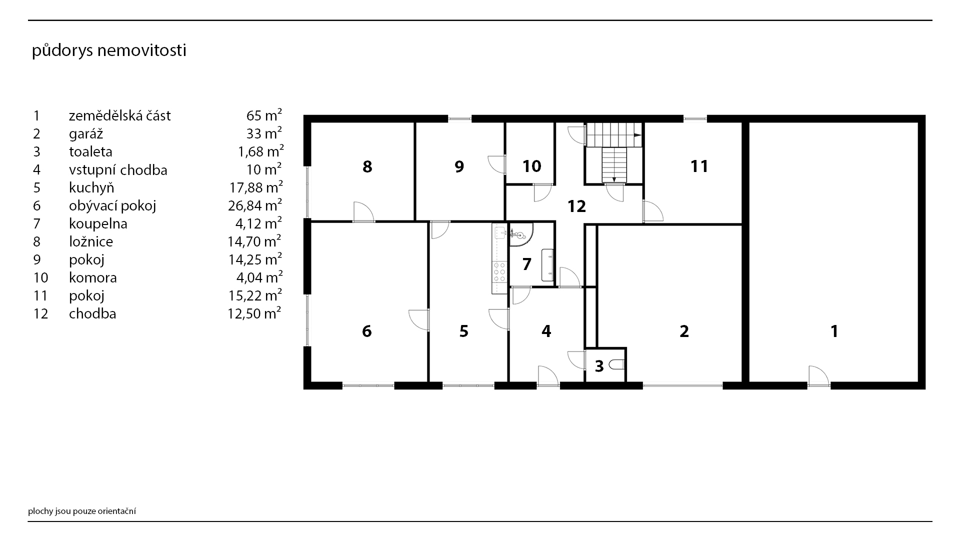 | Užitná plocha | obytná část – cca 120 m2 garáž/dílna – cca 33 m2 hospodářská část – cca 65 m2  |