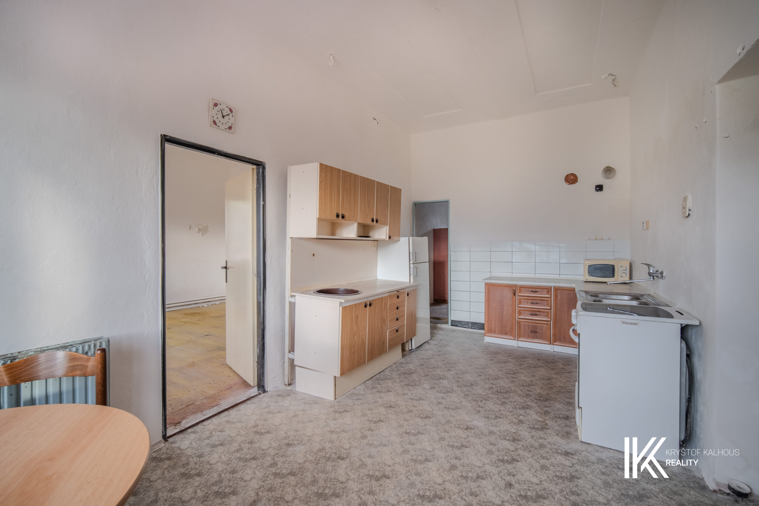 V obytné části domu se nachází šest místností, koupelna a toaleta na užitné ploše cca 120 m2. Vstupní dveře vás zavedou do prostorné chodby, z níž se doleva otevírá vstup do první místnosti – původní kuchyně. Je to srdce domu, prostor, který kdysi naplňovala vůně čerstvě upečeného chleba. Díky svému umístění přímo v centru domu může být ideálním základem pro novou, prostornou kuchyň s jídelním koutem, kde se budou scházet rodina i přátelé.