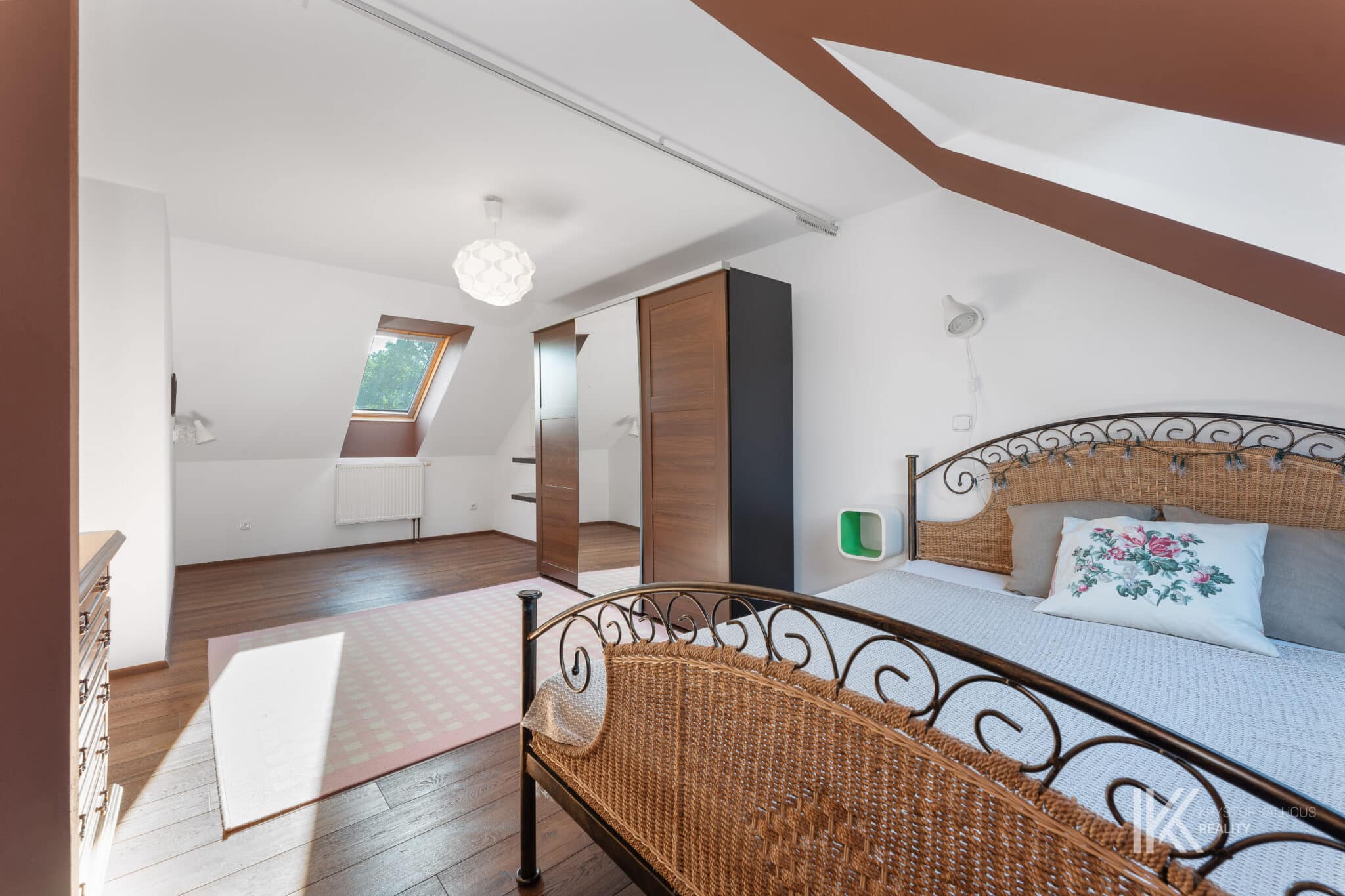 V druhém patře, podkroví naleznete dva prostorné samostatné pokoje a odpočinkovou zónu, která lze příčkou přepažit na samostatný pokoj. Koupelna včetně toalety je samozřejmostí i v tomto patře. Místnosti jsou zde dostatečně světlé a to díky velkým střešním oknům a světlíku, který se nachází přímo nad schodištěm.