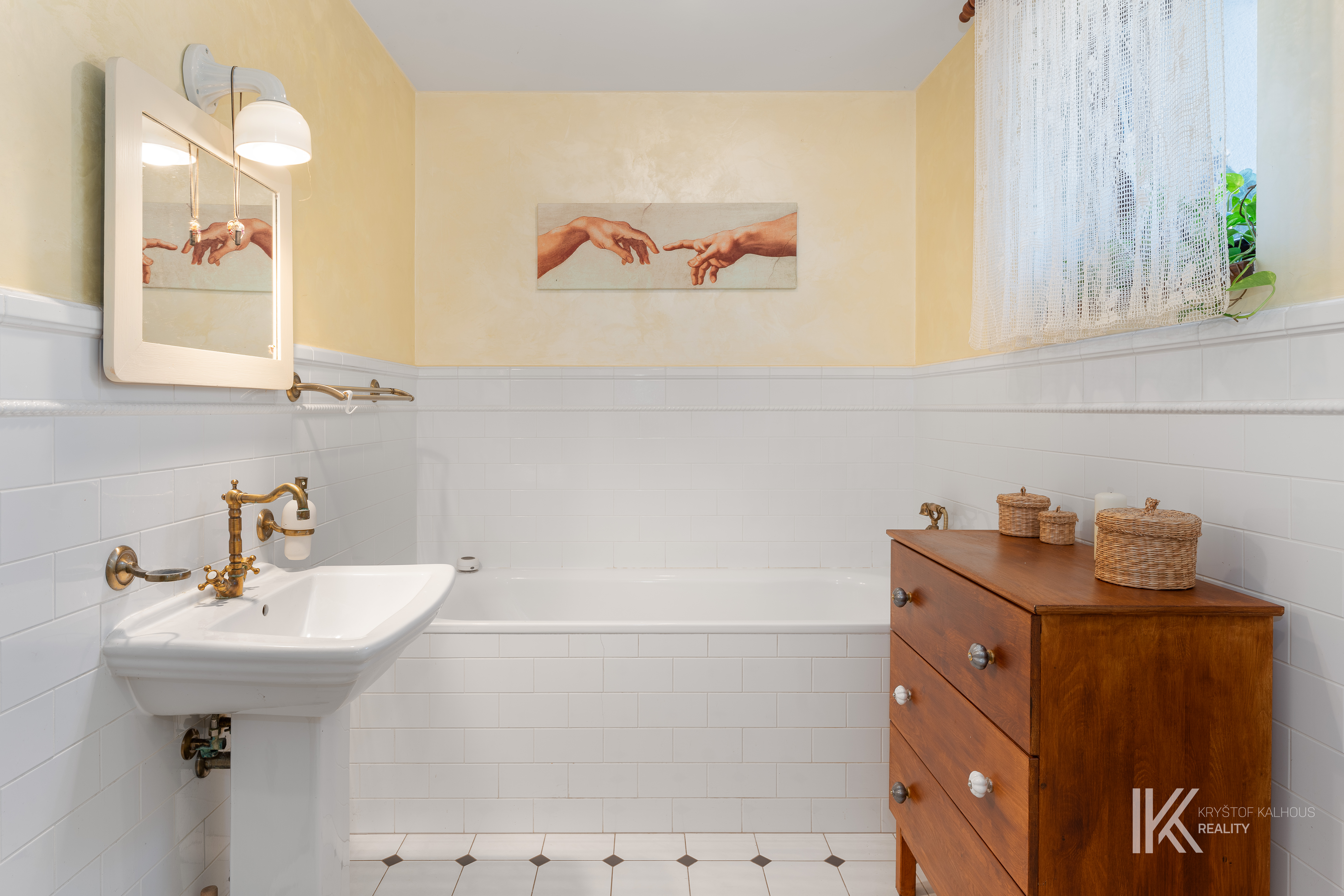 Přízemí vám poskytne zimní zahradu, přes kterou vstupujete do hlavních místností. Prostorného obývacího pokoje, který je propojen s kuchyňskou částí. Zde byly v rámci rekonstrukce zachovány klenuté stropy, které společně s krbem a vybavením včetně podlah z masivního dřeva dávají tomuto prostoru nezaměnitelný půvab. Dále se v přízemí nachází koupelna s vanou, sprchovým koutem a toaletou, šatna propojená s technickým zázemím a spíž na uchování potravin.